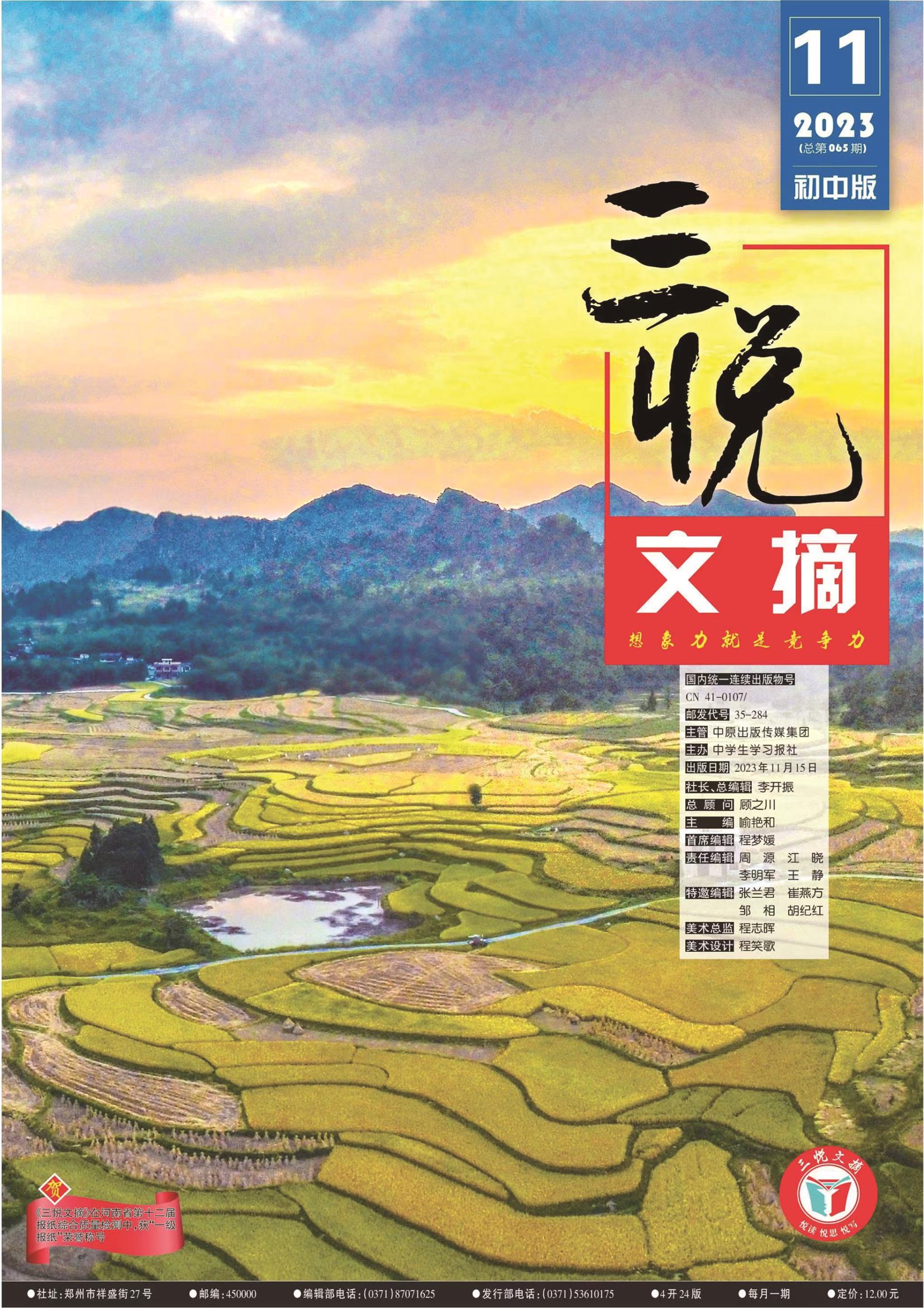 《三悦文摘》初中版围绕“悦读、悦思、悦写”核心理念,以统编版初中语文教材为依托,紧扣《义务教育语文课程标准(2022年版)》,以中考考点为核心,以最能让学生提高分数的新闻素材和多文本阅读材料为载体,以“语文趣味”为切入点,引导学生“在阅读中思考,在阅读中积累语文素材,在阅读中提升写作”,尽可能开阔视野,拓展学习语文的维度,实现在阅读和写作中提高语文的核心素养和关键能力,最终从根本上提高语文考试成绩,辅助教师完成“立德树人”的根本任务。