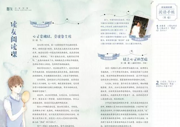 《读友》就是一本呈现文学之大“美”的少年文学读本。我理解阅读文学作品的过程就是一个审美的过程,作为儿童心理专业研究者,我遵循儿童心理的成长特点来创制《读友》。从选文到配图、从文章顺序安排到美术编排设计都依照由浅入深、由表及里、由感性到理性、由理解到想象、由体验到评价的儿童审美规律,反映在阅读《读友》的审美活动中。