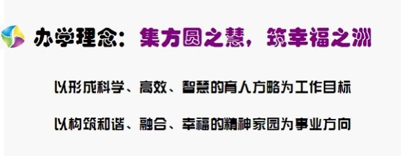 “集方圆之慧,筑幸福之洲”。方洲人秉承“智圆行方”的学校校训,以“博采众长”“教及四方”“学遍五洲”作为学校三风,儿童画创作为学校特色,足球运动为“一校一品”,动静结合,促进学生发展。学校广纳贤言,齐聚良师,育孕英才。在园区管委会的正确领导和大力扶持下,在社会各界的期待和关爱下,方洲这艘满载着理想的“希望之舟”,已经扬帆远航,驶向灿烂美好的明天。