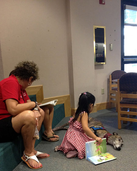除了可以在这里看书借书外,图书馆的儿童部还经常会有各种活动,比如故事会呀,手工活动,乐高积木派对等等。这其中最吸引我的活动之一就是给狗读书的活动。以前我以为我们这边没有这个活动,但事实上在我们的城市和周边的城市都有给狗狗读书的活动,只是活动的名字不同而已。我们去了临近城市的图书馆,这里的活动叫reading with Annie,每个月一次由义工带着自己的狗Annie来到图书馆聆听孩子们读书.Annie是只退役的治疗犬greyhound(灰狗)。
