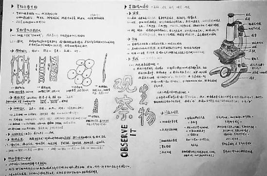 在数学笔记上尝到甜头后,徐莹的热情一发不可收拾,她又把兴趣转到了生物笔记上。今年放寒假前,生物老师布置了一个任务:把初中三年的生物知识点都梳理出来。生物知识很枯燥,一堆艰涩难懂的名词要记,怎么办?“当然是画着记!”徐莹马上把做数学笔记的经验运用到了做生物笔记上。将生物学知识点画出来,说说容易,做做难。但和别的孩子比起来,徐莹说自己有一个“秘密武器”:爸爸妈妈都是从医的,爸爸是外科医生,妈妈是产科护士,都是生物知识的活字典。在日常生活中,爸爸就常常给徐莹“上课”,让女儿明白什么叫生动和直观。