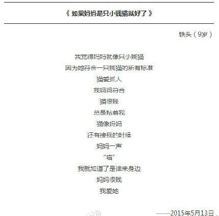 【少儿期刊】9岁的梁胜杰6岁开始写诗,如今已写成200多首。近日,其系列萌诗得到了清华大学出版社的出版。"开始是妈妈逼的,被逼到了9岁..."。他的诗,满是萌萌哒:“妈妈很贱,我爱她””“你推我你又亲我..妈妈我服了。