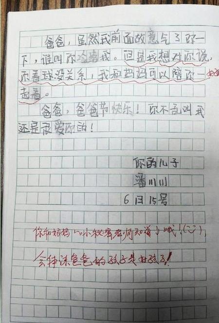 当你看见这封信的时候,我已经不“家”(老师批注:宝贝,别乱漏字哦,老师不知道你爸爸心脏好不好)在了。爸爸说实话,我最近有点忍不 了你。你老是看球也不理我和妈妈了,嘴巴里全是球球球球。有时候半夜还乱叫,吓得我眼睛都变圆了。我和妈妈在你眼里,连个球都不如。哼,我都不想给你过父 亲节了。