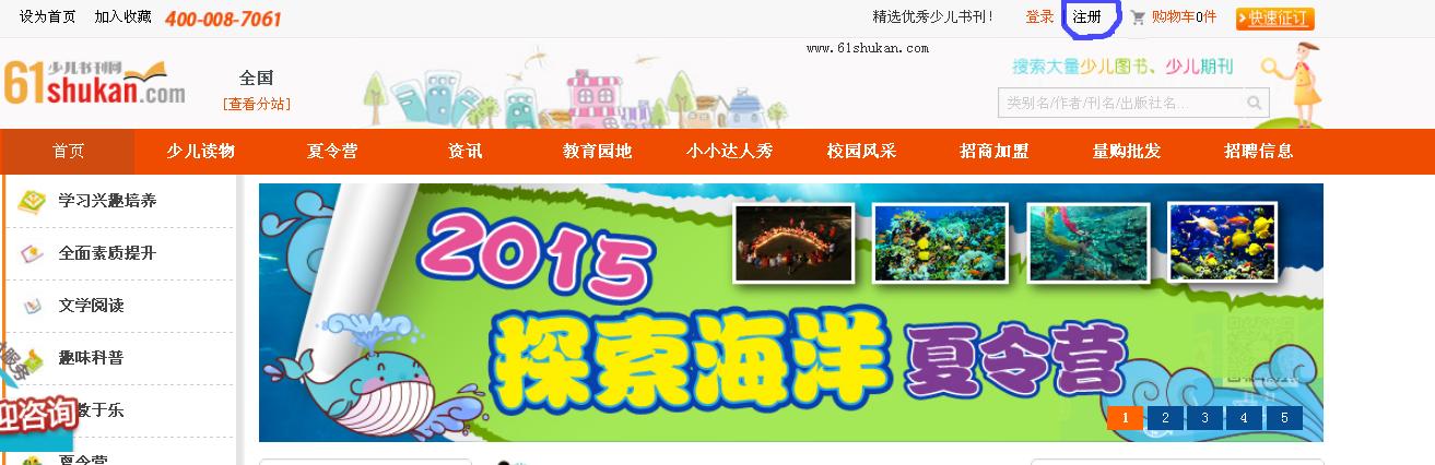 (1)打开61少儿书刊网首页,在右上方,点击“注册”按钮: