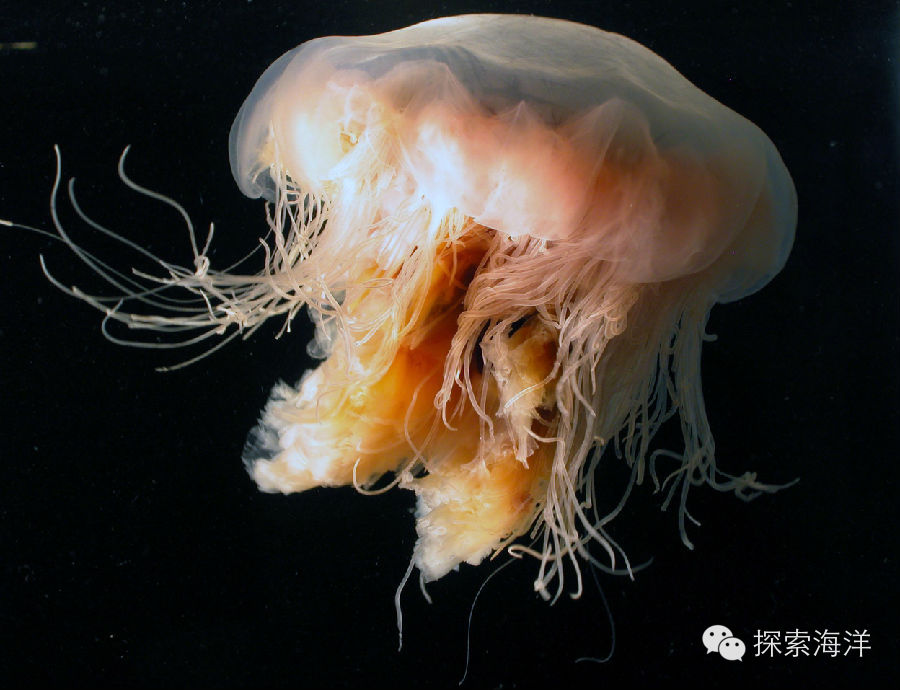 咋一看像蘑菇,其实它是水母。海洋里生活着千姿百态的水母,但这个家伙是水母家族的“巨人”,它的名字叫北极霞水母。到底有多大?我们来数数它的触手便知(触手就是它的“手”,长得很像那些像胡须)。北极霞水母共有1200只触手,触手末端是带毒的刺丝。当这些触手全部展开时,面积可达500平方米。500平方米有多大?大概就是一个篮球场的大小,也相当于一间超市的大小。厉害吧!