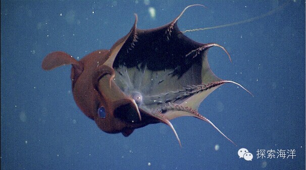 深海里生活着一种神秘的怪异生物,它叫“吸血鬼鱿鱼”。它的身体像个斗篷,还长着一双大大的蓝眼睛和八只“手臂”。但你不要被它恐怖的名字和外形吓到了。其实“吸血鬼鱿鱼”不吸血,它只吃海洋生物腐烂的尸体,是一种很消极被动的生物,几乎没有攻击性。